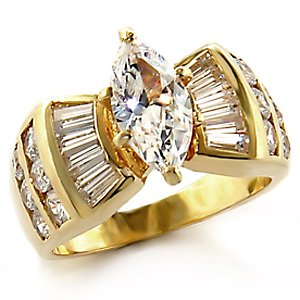 Description:Ooze with drama and style with this charming piece of jewelry art. A marquise cut 1 carat CZ stone nestles flawlessly atop a bed of gold plated metal. Adorned by a clear CZ stones on each side, this sparkling CZ ring will leave any woman spellbound with its beauty and glamour.